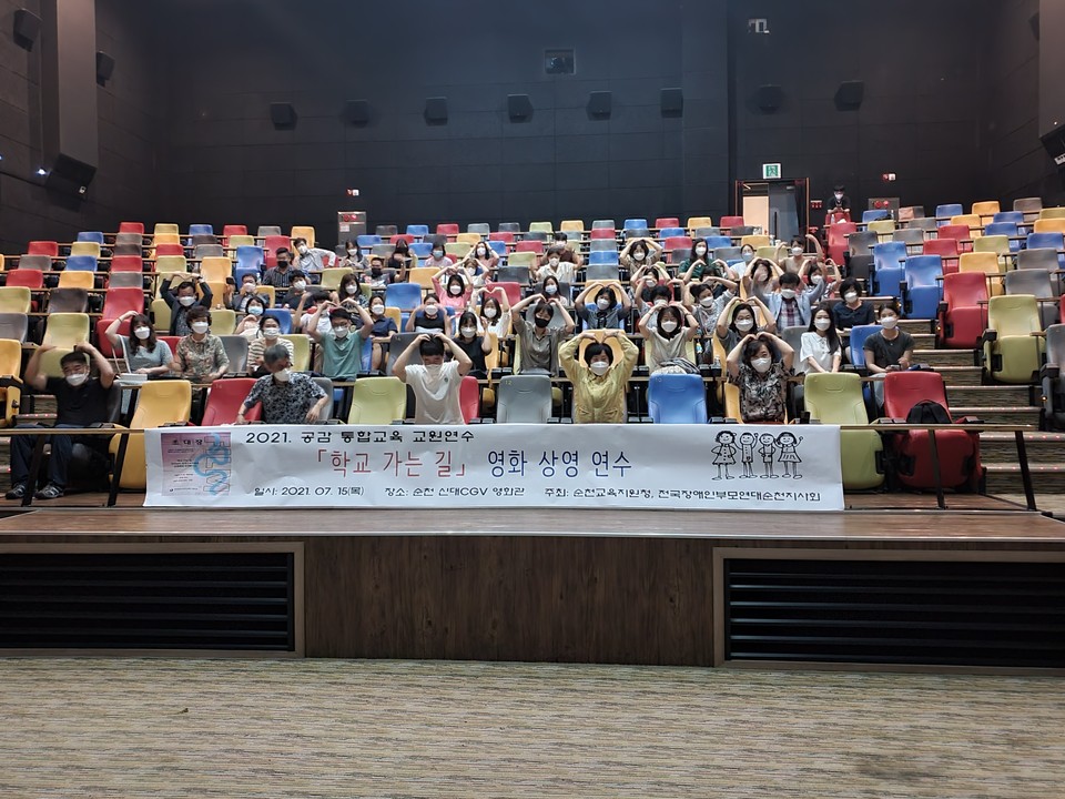 순천교육지원청(교육장 이용덕)은 7월 15일 관내 유․초․중․고 교장, 교감 및 특수교사 99명을 대상으로 CGV 순천신대(제9관)에서 「2021. 공감 통합교육 교원 연수」를 실시 했다.