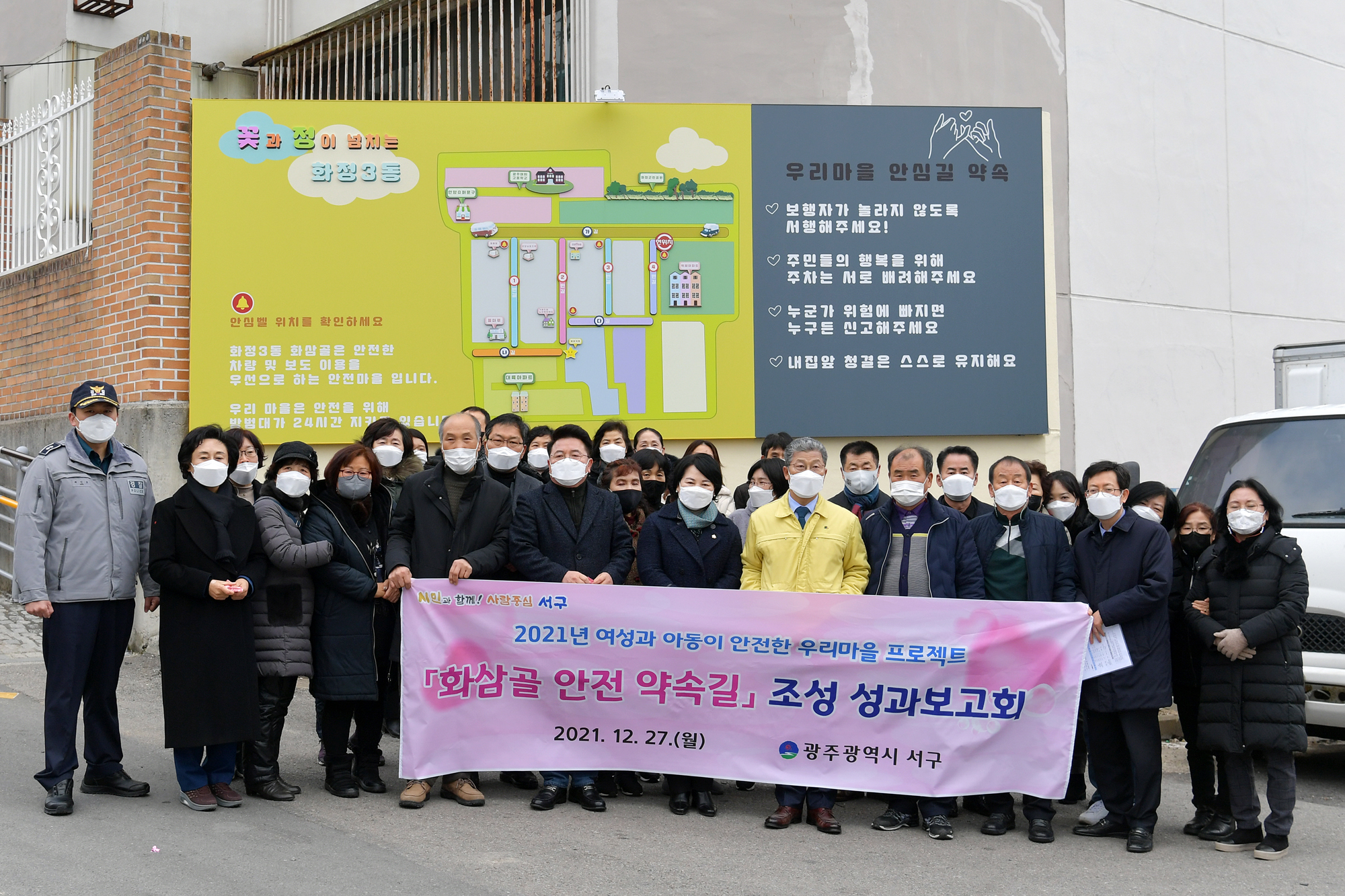 이날 성과보고회는 광주 서부경찰서, 화정3동 주민자치위원회, 여성친화도시 시민참여단, 인근주민이 함께 했으며, 의식행사와 안전마을 투어 순으로 진행됐다.