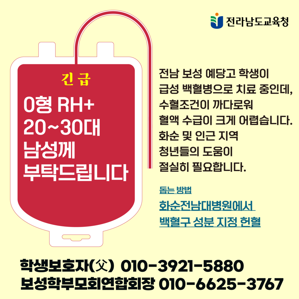 보성교육지원청 관내 백혈병 고등학생 긴급 수혈 도움 요청