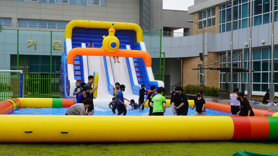운동장에 한가운데 대형 에어 슬라이드, 중형 에어 슬라이드, 풀을 설치했고, 학생들의 안전을 위해 안전요원까지 배치했다.