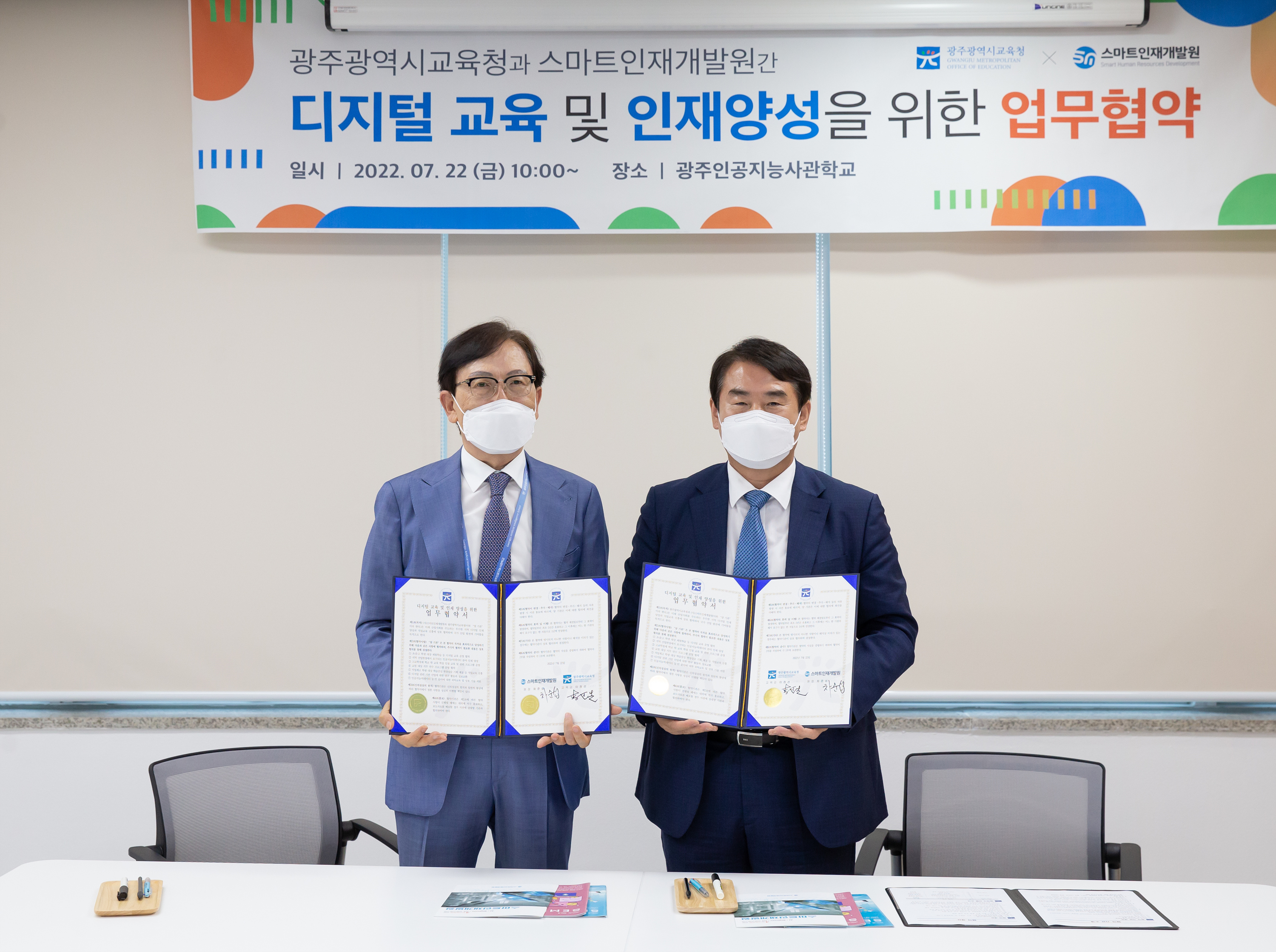 광주교육청이 22일 인공지능 분야를 포함한 디지털 교육 및 인재 양성을 위해 (사)스마트인재개발원(원장 차준섭)과 ‘광주인공지능사관학교’에서 업무협약을 맺었다.