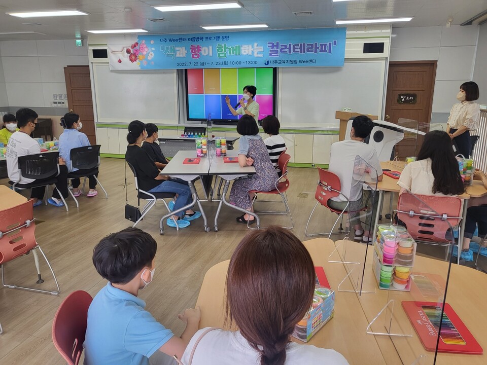 나주 Wee센터는 방학 중에 부모 자녀간에 함께 할 수 있는 시간을 마련하기 위해 ‘색과 향이 함께 하는 컬러테라피’ 힐링 프로그램을 실시했다. 이 프로그램은 색과 향을 통해 자신만의 스트레스를 진단하고 해소할 수 있으며, 부모-자녀간의 심리를 이해하고 기질을 분석해 해석하는 등 학생과 학부모들로부터 긍정적인 반응을 이끌어 내며 큰 호응을 얻었다.
