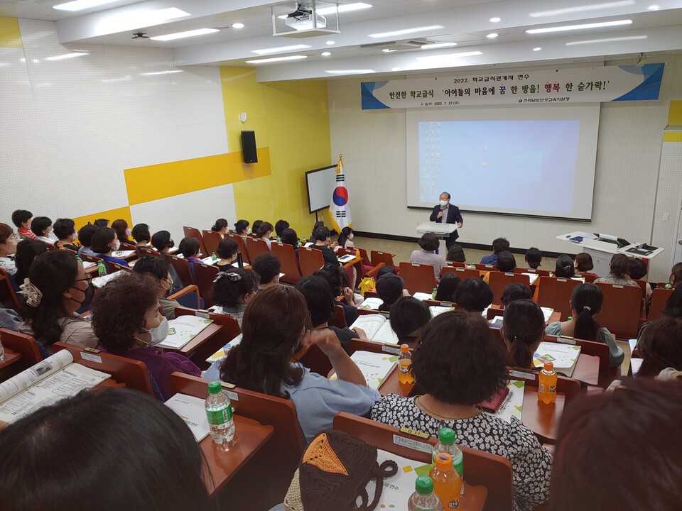 보성교육지원청(교육장 전희)은 관내 조리사, 조리원 등 90여명을 대상으로 학교급식의 질 향상과 위생․안전 의식 확보, 그리고 직장 내 친절문화를 확산 시키고자 '안전한 학교급식 아이들의 마음에 꿈 한 방울! 행복 한 숟가락!'이라는 주제로 '2022. 학교급식 관계자 연수'를 실시했다.