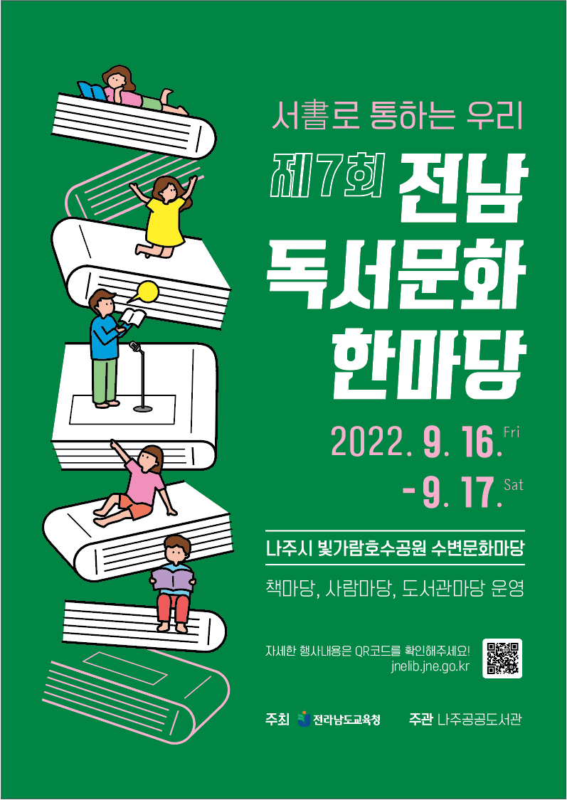 전남교육청이 주최하고 나주공공도서관이 주관하는 ‘제7회 전남독서문화한마당’은 9월 16일부터 17일까지 2일간 ‘서書로 통하는 우리’라는 주제로 나주시 빛가람호수공원 수변문화마당에서 운영한다.