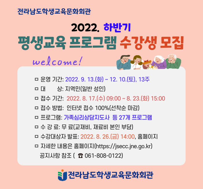 전남학생교육문화회관(관장: 김태문)은 오는 17일부터 23일까지 지역주민을 대상으로 ‘2022년 하반기 평생교육 프로그램’ 수강생을 모집한다.