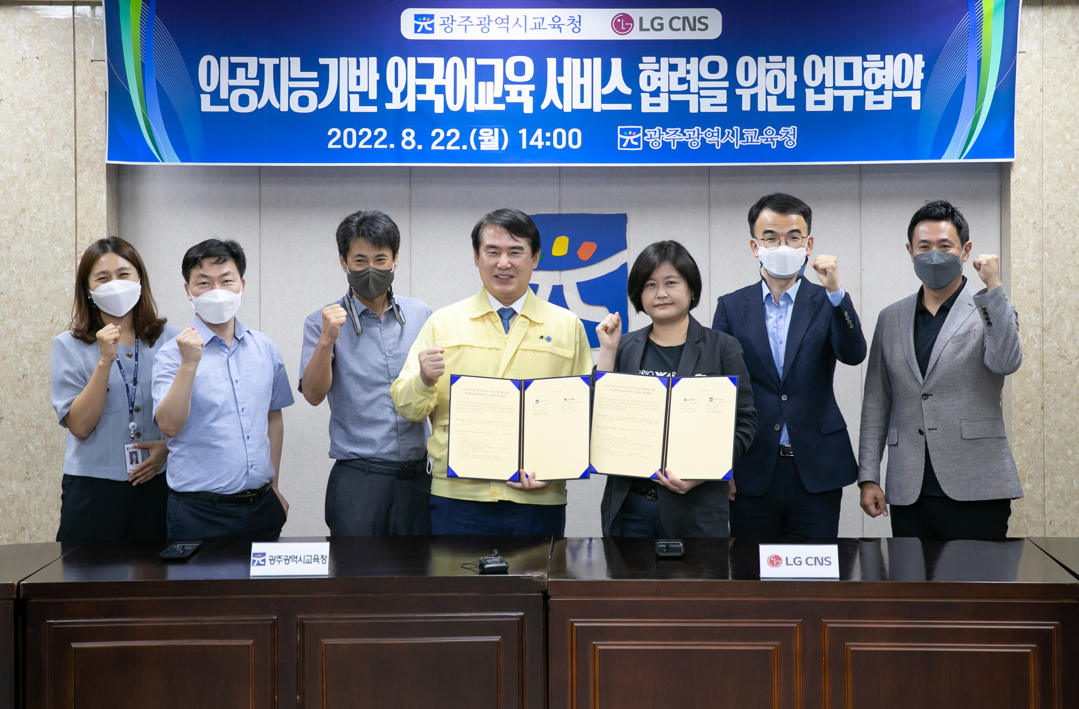 광주교육청(교육감 이정선)은 22일 LG CNS(대표 김영섭)와 ‘인공지능 기반 외국어 교육 서비스 협력’을 위한 업무협약을 체결했다. 이번 업무협약은 교육 현장에 인공지능 기반 외국어 학습 환