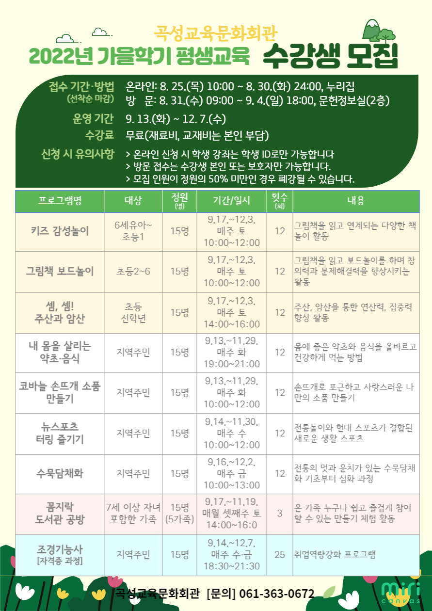 곡성교육문화회관(관장 박정희)은 오는 25일부터 2022년 가을학기 및 취업역량강화 프로그램 수강생을 선착순 모집한다.