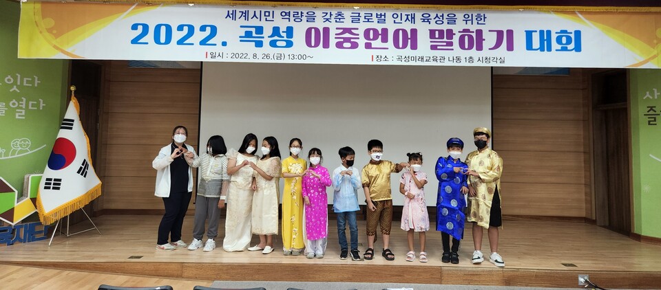 곡성교육지원청(교육장 김선수)은 지난 26일 곡성미래교육관 나동 1층 시청각실에서 관내 초‧중‧고등학교 다문화가정 학생을 대상으로 세계시민 역량을 갖춘 글로벌 인재 육성을 위한 ‘2022. 곡성 이중언어 말하기 대회’를 개최했다.