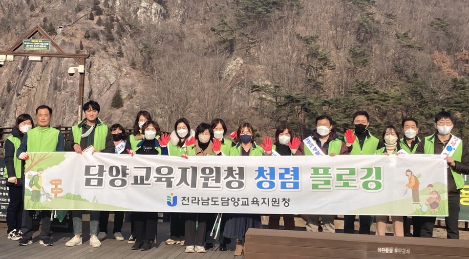 담양교육지원청(교육장 이숙)은 지난 9일 지역의 관광명소 중 한 곳인 추월산 용마루길에서 ‘청렴 플로깅(조깅하면서 쓰레기를 줍는 자연보호활동) 캠페인’을 전개했다.