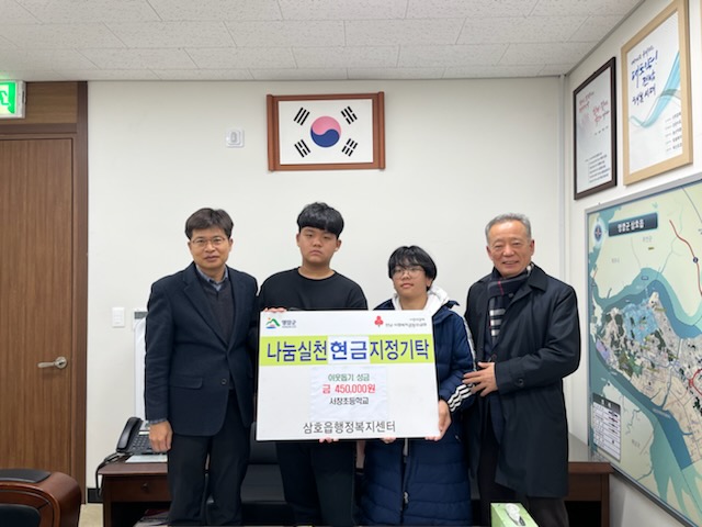 마인구 삼호읍장은 “학생들이 예쁜 마음을 담아 어렵게 모아준 성금인만큼 필요한 분들에게 소중히 전달하겠다”고 말했다.