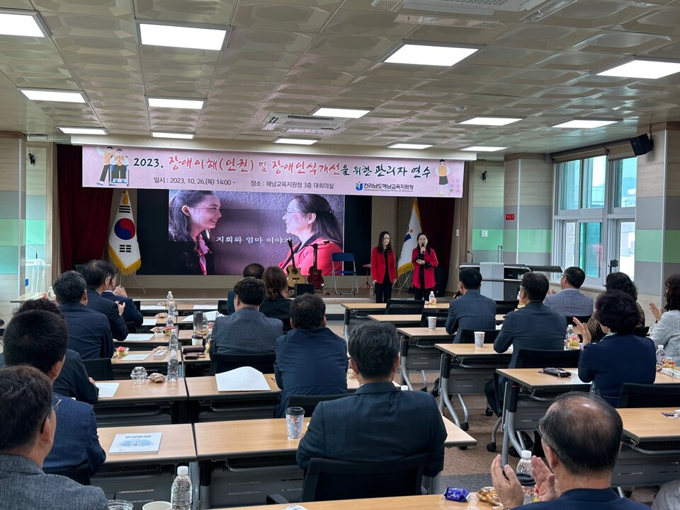 해남교육지원청(교육장 이자영)은 26일 본관 대회의실에서 관내 유초중고 교장 40여명이 참석한 가운데 장애이해 및 장애인식개선을 위한 연수를 개최했다. 이번 연수는 장애에 대한 편견과 차