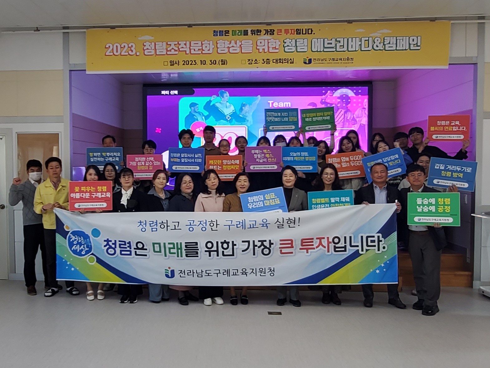 구례교육지원청(교육장 신제성)은 지난 10월 30일 대회의실에서 전 직원 70여 명이 참석한 가운데 직장 내 청렴조직문화 확산과 내부청렴도 향상을 위해 이색적인 '청렴 에브리바디&캠페인'을 실