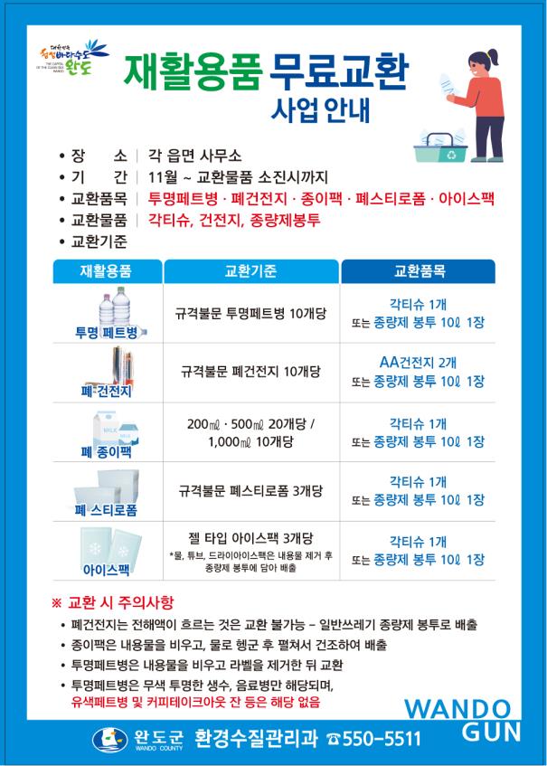 완도군은 올바른 분리배출 문화를 확산시키기 위해 6일부터 연말까지 군민들을 대상으로 ‘재활용품 무료 교환’ 사업을 추진한다.