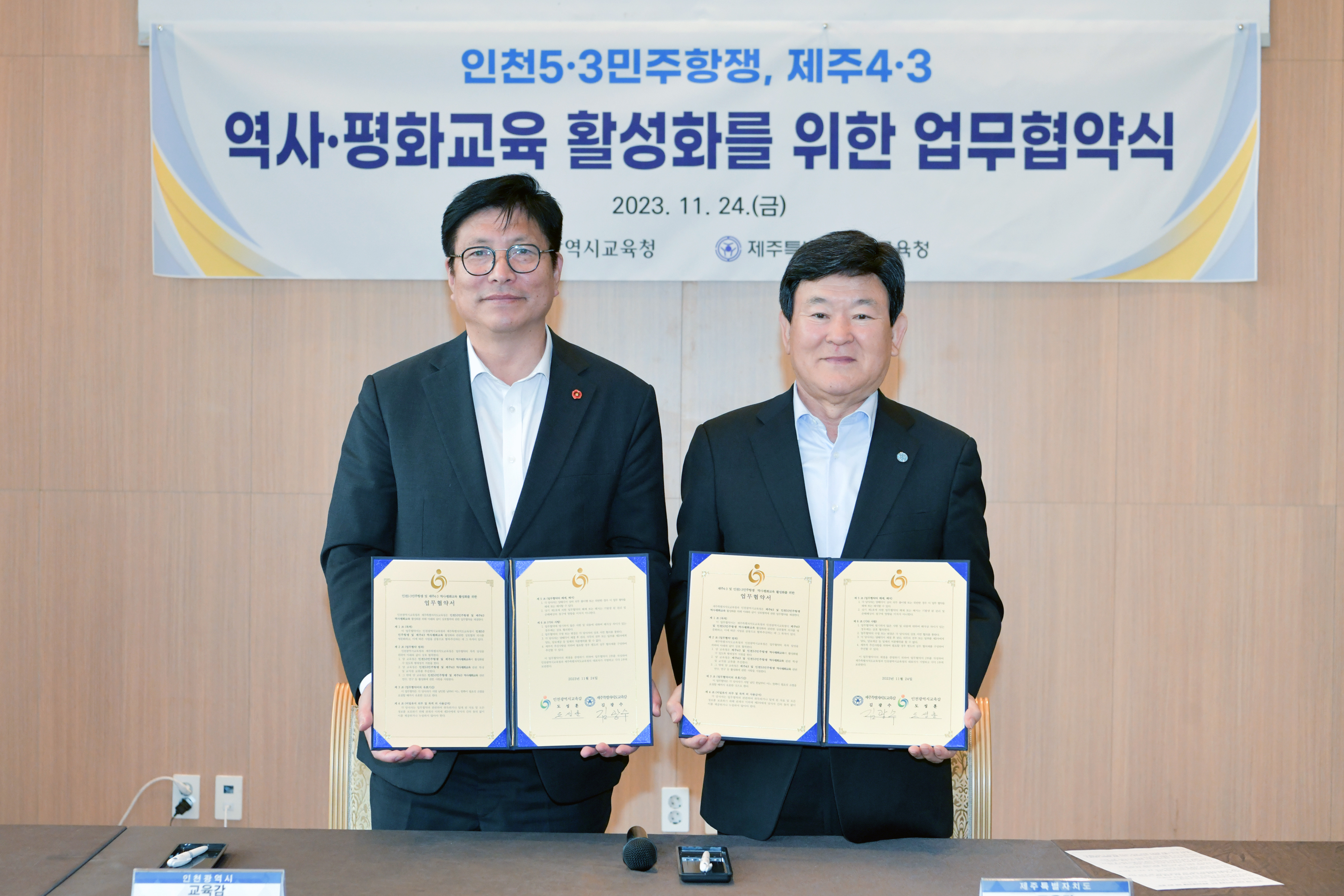 제주교육청과 인천교육청(교육감 도성훈)은 24일 인천에서 ‘제주4·3 및 인천5·3민주항쟁 역사·평화교육 활성화를 위한 업무협약’을 체결했다.