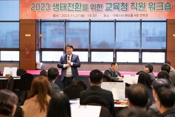 이번 워크숍에는 시교육청 직원 120여 명이 참석해 생태 전환을 기반으로 각종 교육사업 운영 방침을 수립하기 위한 논의를 펼쳤다.