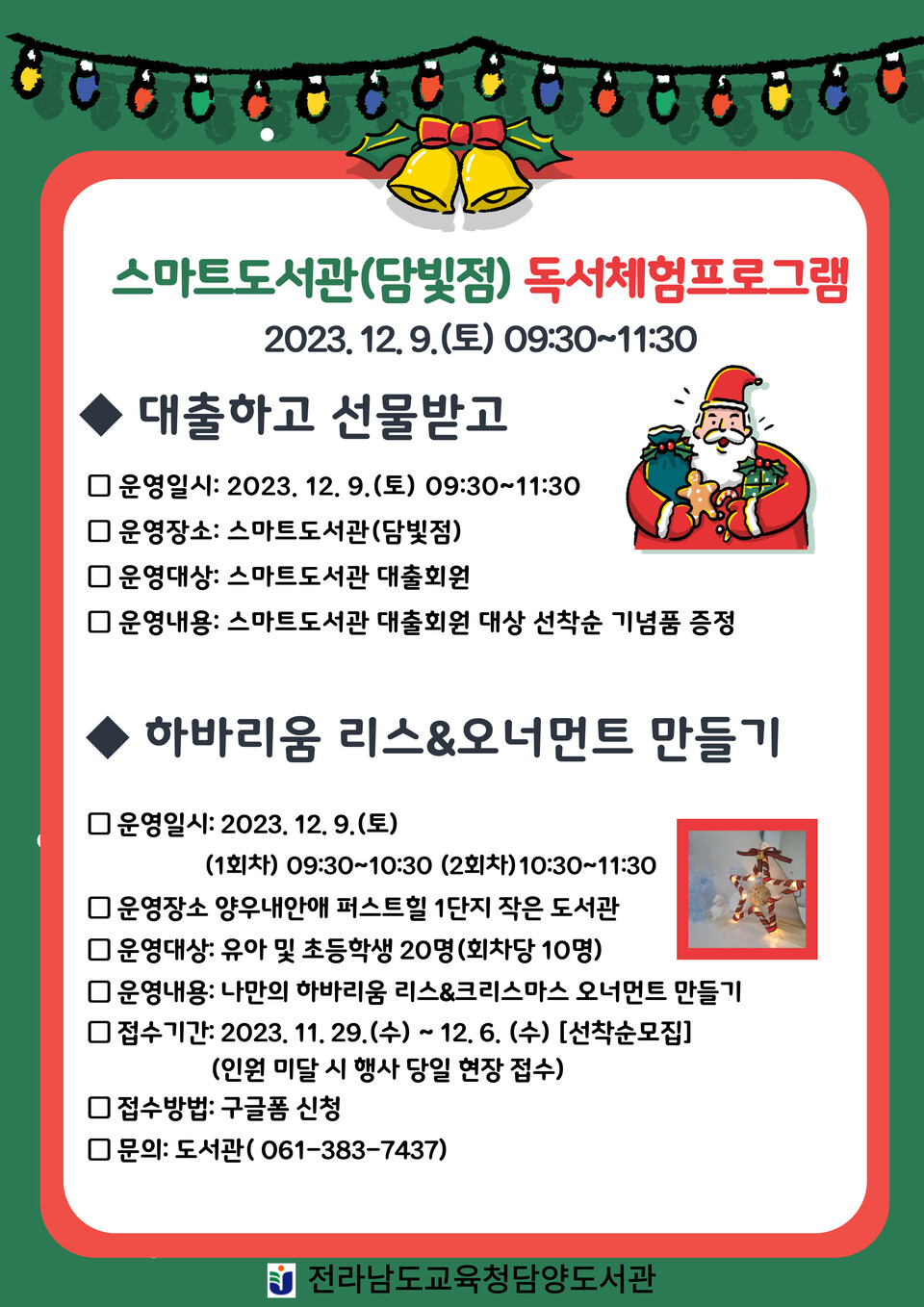 12월 9일에는 스마트도서관(담빛점, 매화점)에서 행사 당일 도서 대출자를 대상으로 선물을 증정하는 이벤트 ▲대출하고 선물받고와 어린이 대상 체험 ▲하바리움 리스&오너만트 만들기 행사를 진행한다.