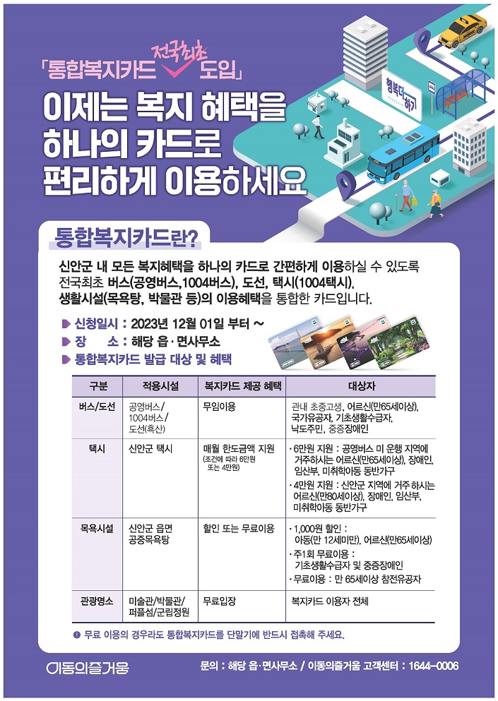 [신안=차승현기자] 신안군(군수 박우량)은 오는 12월 1일 관내 분야별로 분산된 복지 혜택을 하나로 통합하고 이용자의 편의를 개선한 통합복지플랫폼 ‘행복 더하기 통합복지카드’ 서비스를