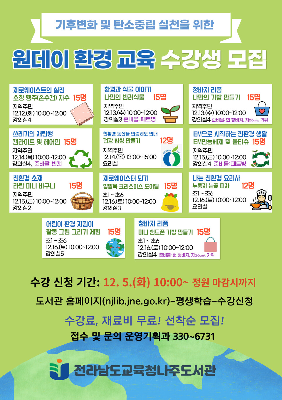 [나주=박소연기자] 나주도서관(관장 양창완)은 오는 12일부터 16일까지 5일간 기후 변화 대비 및 탄소 중립을 위한 ‘원데이 환경 교육 프로그램’을 운영한다.