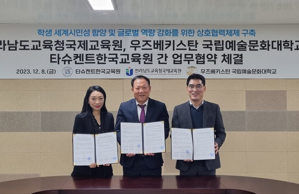 [여수=오나연기자] 전남국제교육원(원장 허광양, 이하 국제교육원)은 지난 8일 타슈켄트 한국교육원 및 우즈베키스탄 국립예술문화대학교와 업무협약을 체결했다. 이날 협약식은 허광양 원장을