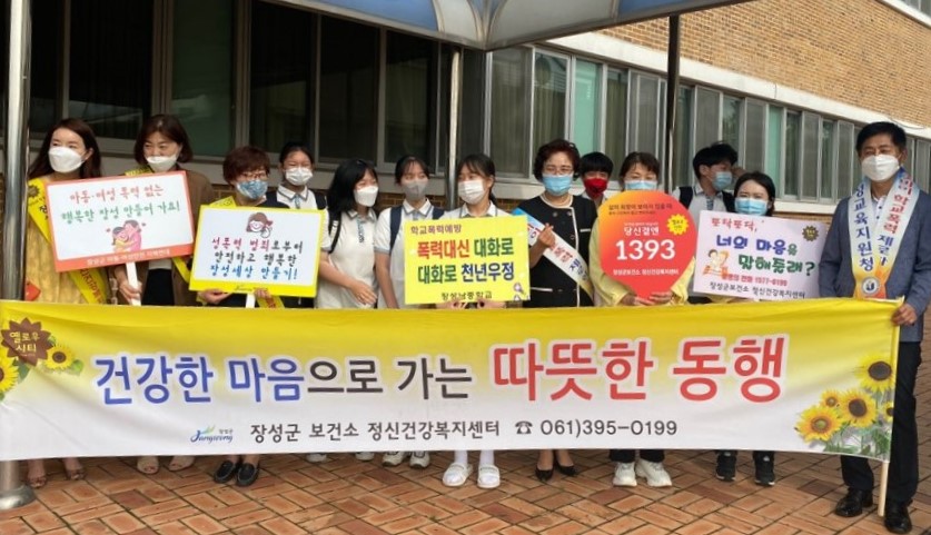 ‘건강한 마음으로 가는 따뜻한 동행’이라는 주제로 지난 11일부터 열린 이번 캠페인은 장성 지역 7개 학교에서 순차적으로 열렸다. 장성군 보건소 담당자와 상담부 학생 등 10여 명이 학교 앞 등굣길에서 피켓을 들고 희망적인 메시지를 전하는 방식으로 진행됐다.