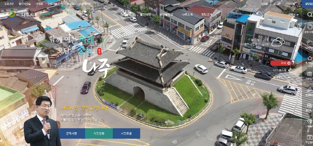 좌측 상단에는 문화관광·나주시의회·농업기술센터·보건소 홈페이지를 비롯해 시장과 시민의 소통 창구인 ‘열린시장실’, 나주시의 다양한 정책을 인포그래픽으로 한 눈에 볼 수 있는 공공데이터 ‘데이터나루’ 접속링크를 배치했다.
