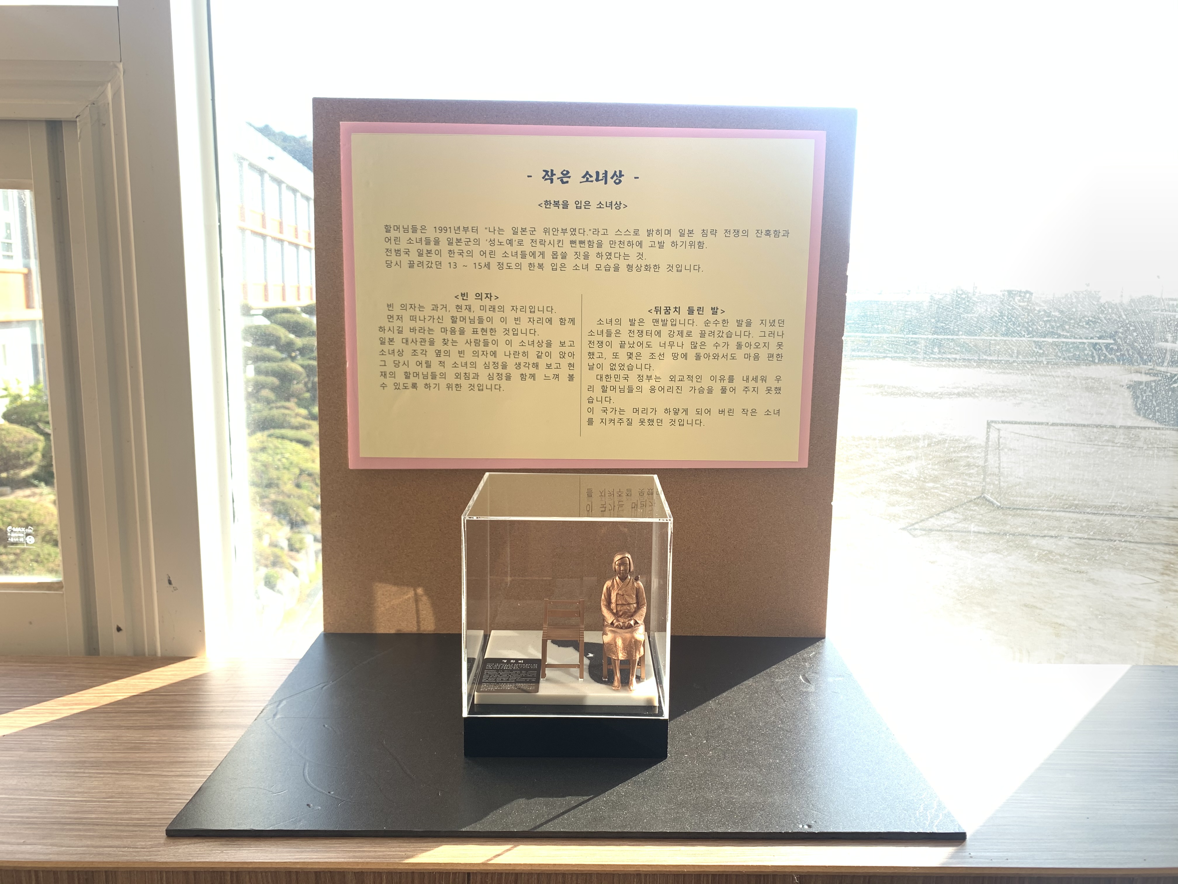 ‘평화의 작은 소녀상’은 빈 의자 한 개, 소녀상으로 구성됐다. 소녀상에 담긴 정신과 의미들을 잘 이해할 수 있도록 학생들이 직접 설명글을 제작·비치해 역사적 이해를 도왔다.